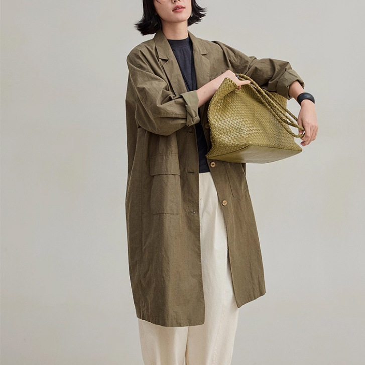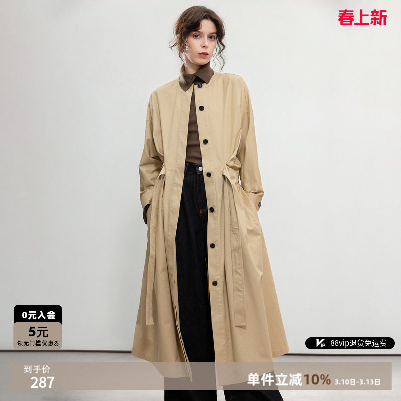 谷家 100%匹马棉文艺复古中长款风衣外套 宽松有型翻领通勤上衣女
