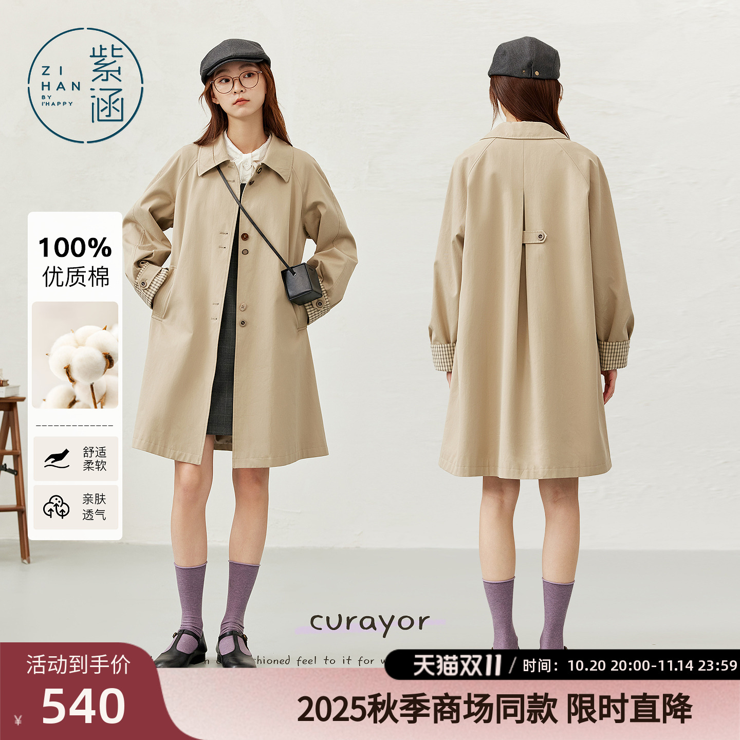 紫涵中长款翻领风衣女2025年秋季新款文艺气质宽松显瘦单排扣外套