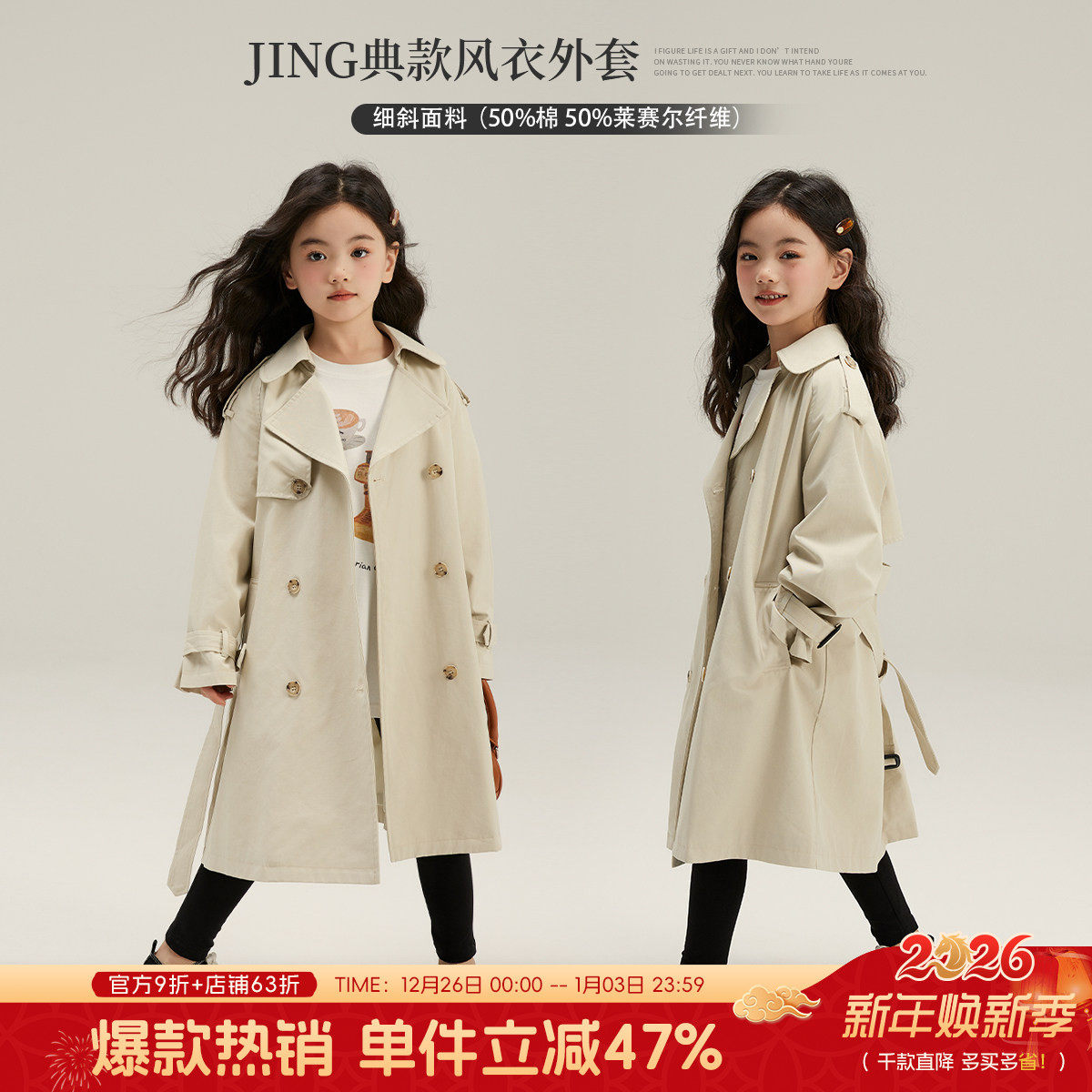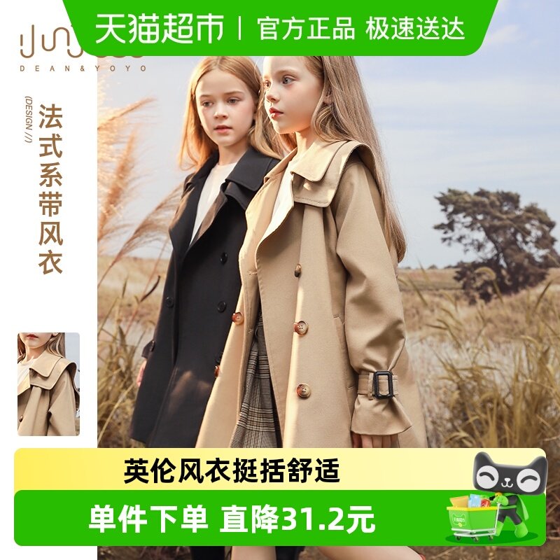 大耳象女童翻领长款风衣外套2026春季新款宝儿休闲复古长袖上衣