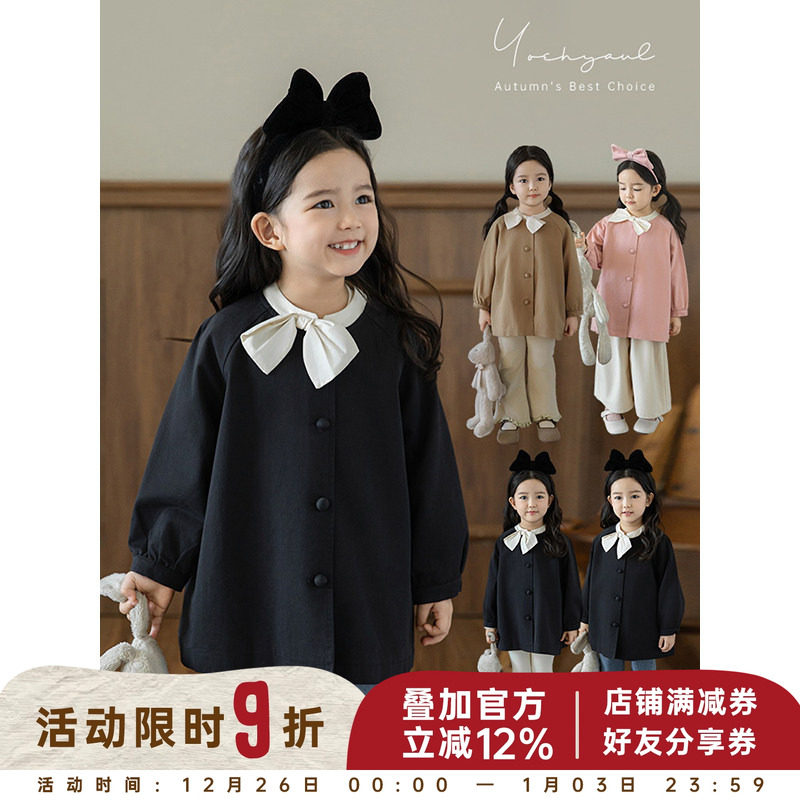 幼悠女童甜美娇俏蝴蝶结风衣中长款春秋撞色吸睛舒适领圈休闲外套