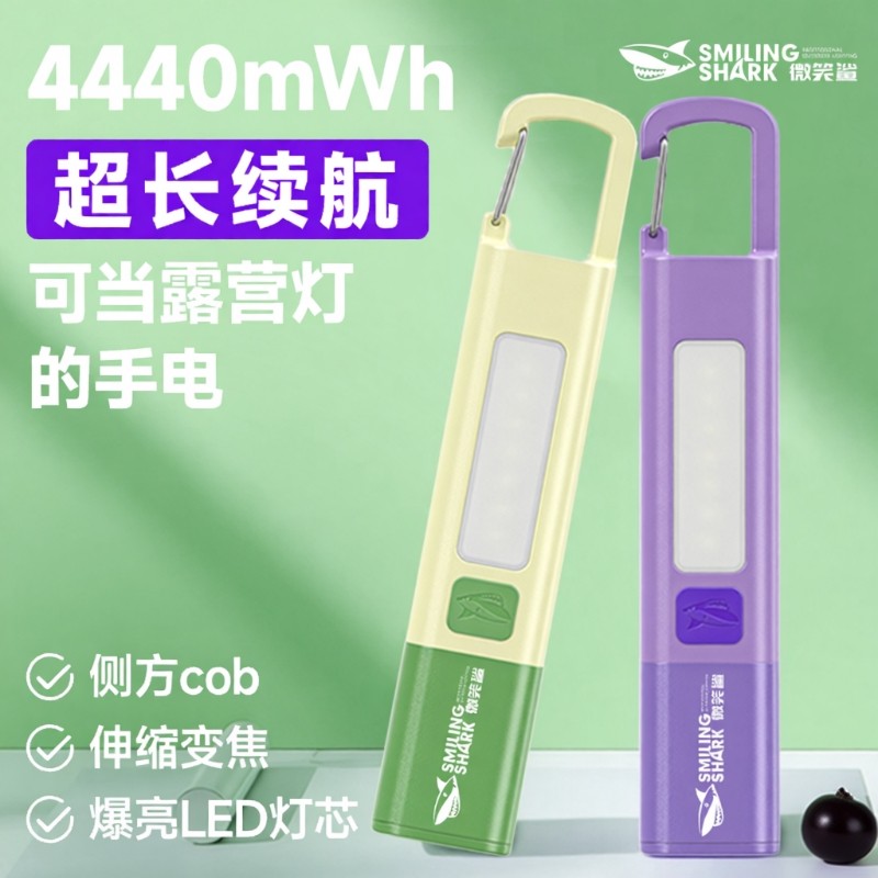 微笑鲨强光照明手电筒便携白激光伸缩变焦户外应急手电家用充电式