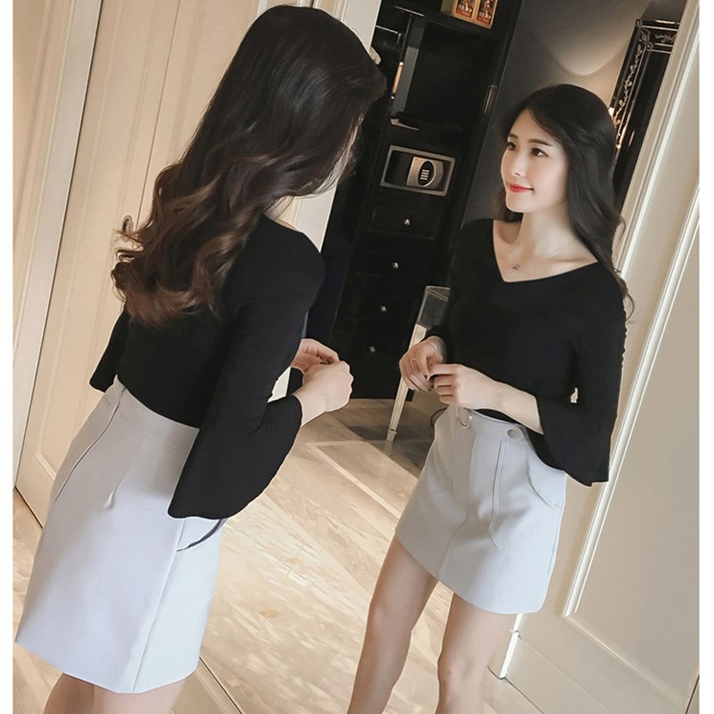2024春夏韩版V领喇叭袖上衣女中袖V领t恤大袖口荷叶袖学生打底衫