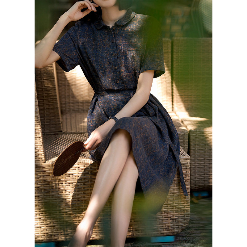 现货 香云纱龟裂纹真丝连衣裙100%桑蚕丝中长款翻领系带长裙夏