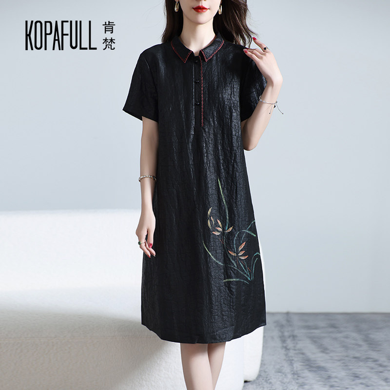 2026年新款真丝香云纱连衣裙女黑色中长款优雅刺绣桑蚕丝衬衫裙子