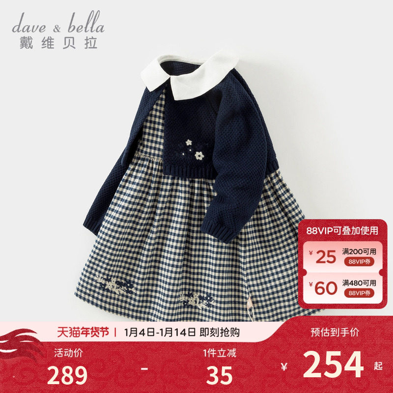 戴维贝拉儿童毛衣连衣裙2026春装女童假两件针织裙宝宝长袖厚裙子
