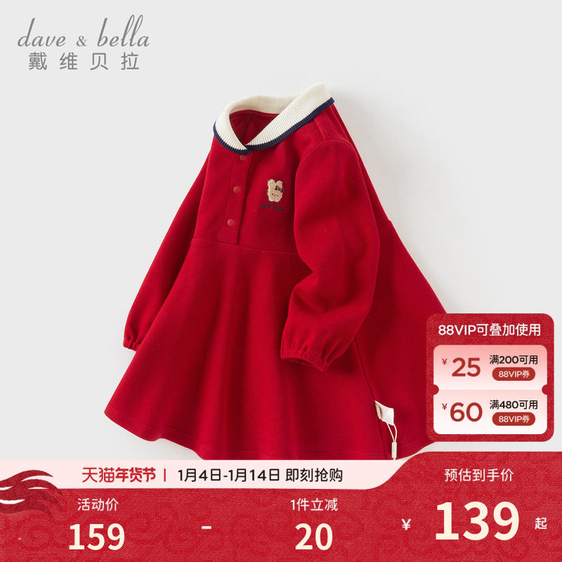 戴维贝拉女童连衣裙春装儿童新年红色公主裙周岁女宝礼服裙子洋气