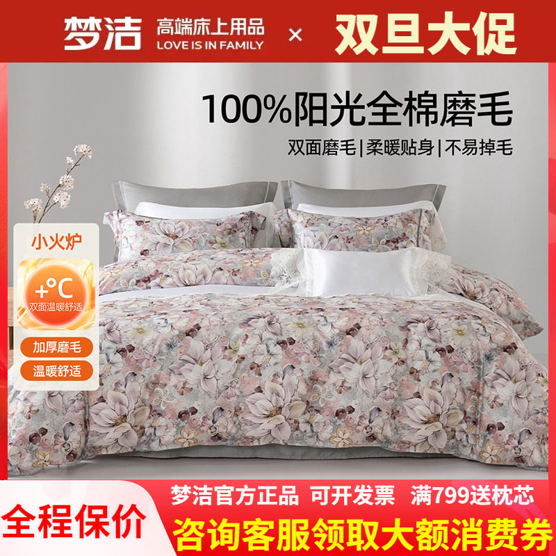 梦洁家纺全棉磨毛四件套纯棉保暖2025年新秋冬季床单被套加厚花影