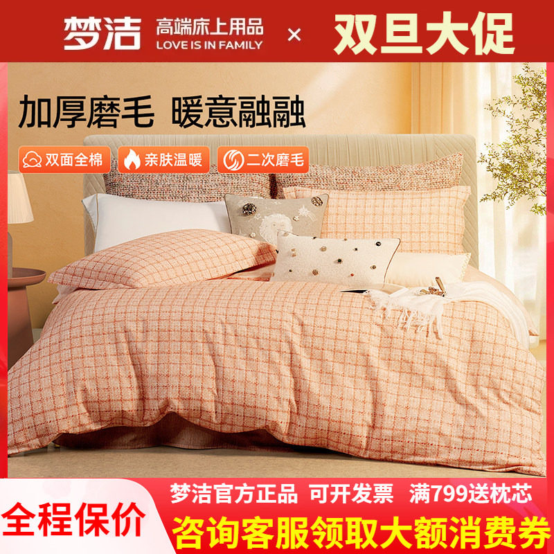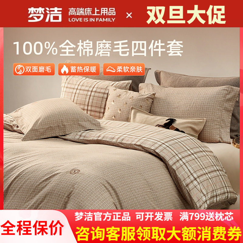 梦洁磨毛四件套纯棉全棉简约秋冬季加厚保暖床单248被套嘉柏利尔