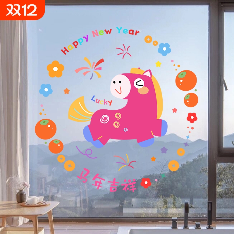 马年吉祥窗花装饰品2026新款窗户贴画玻璃门卧室春节过年彩色贴纸