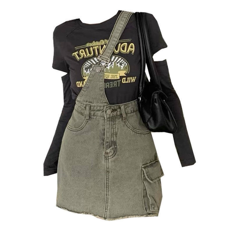 大码胖mm设计感不规则背带收腰显瘦牛仔裙百搭上衣两件套装女夏季