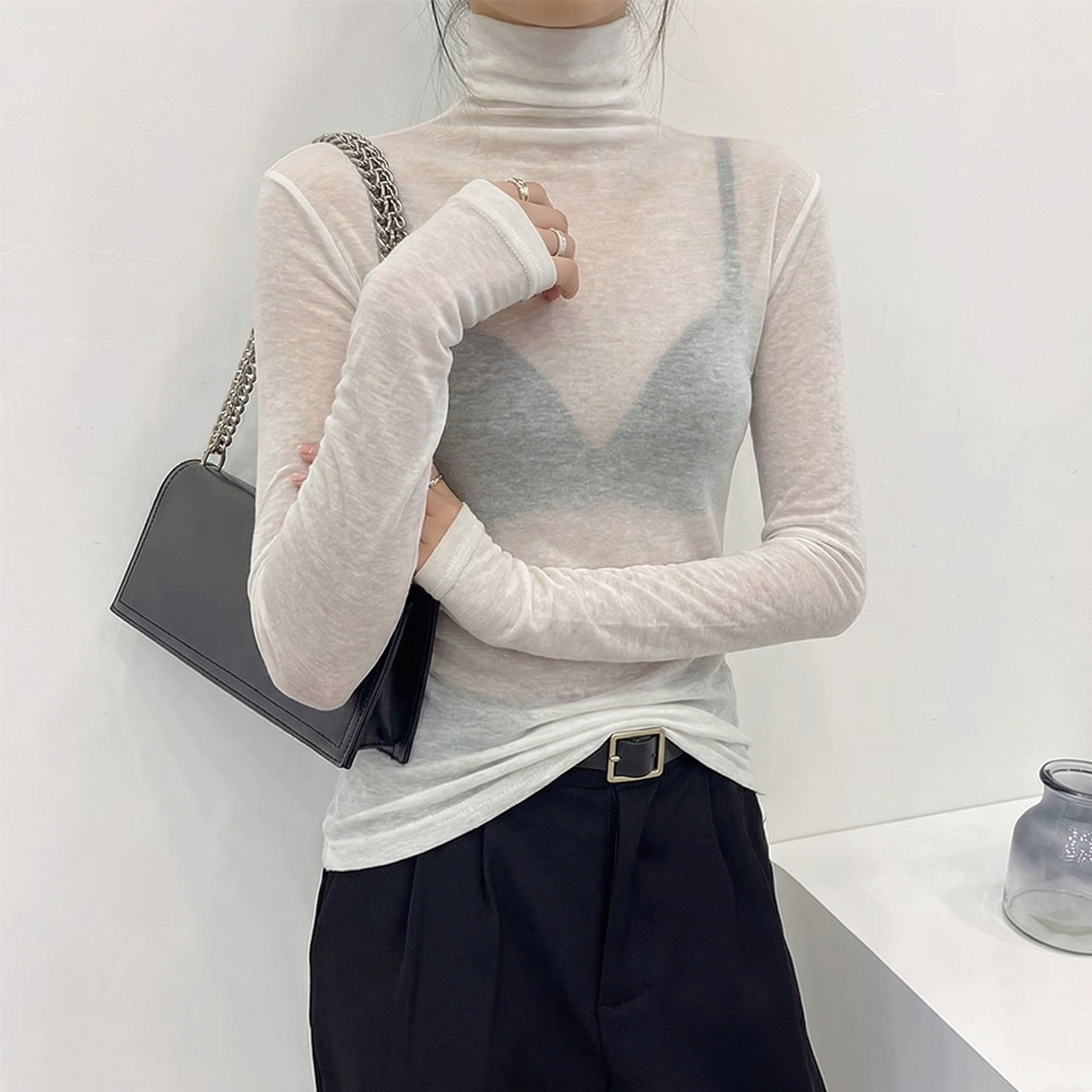 高领白色品牌打底衫女正品高档内搭可外穿薄款微透修身上衣高级感