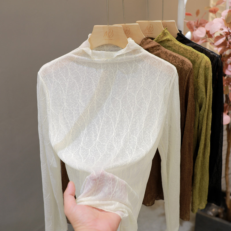 春装新款高领网纱打底衫女薄款韩版内搭蕾丝夏季时尚洋气长袖上衣