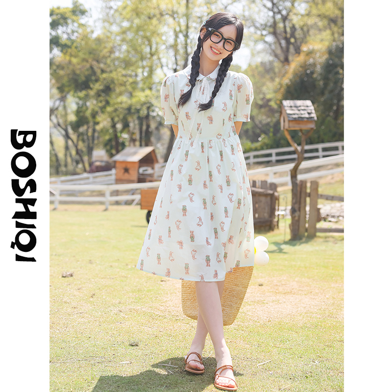 2025春夏新款文艺a字宽松显瘦大摆中长短袖女学生娃娃连衣裙休闲