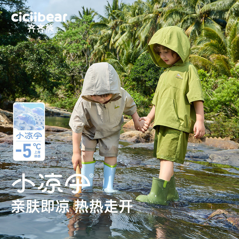 [山系户外]齐齐熊男童夏装套装凉感儿童连帽短袖宝宝夏季潮童装女