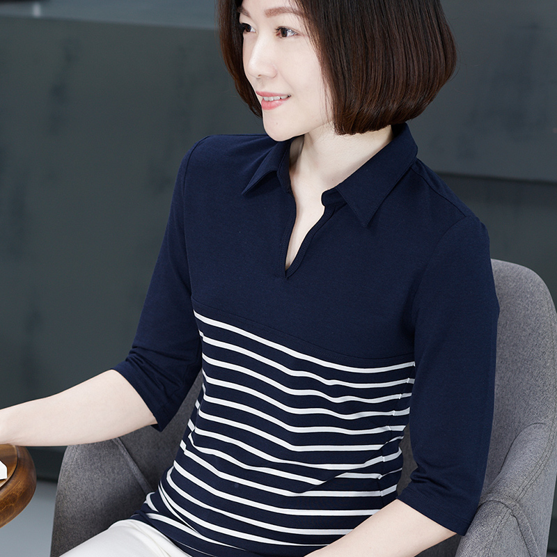 百搭polo领七分袖上衣大码修身翻领黑白条纹中袖T恤女莫代尔夏装