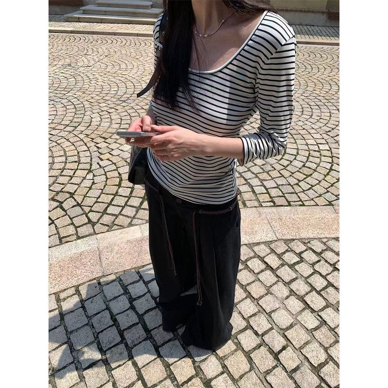 【5折款】橘子树在哪儿正肩条纹u领中袖t恤女秋季气质内搭打底衫