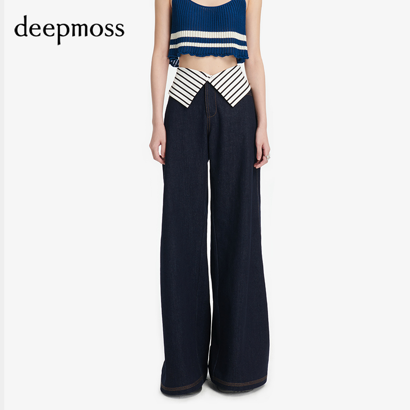 【deepmoss】优雅女士时尚复古潮流条纹翻边阔腿牛仔裤高腰烟筒裤