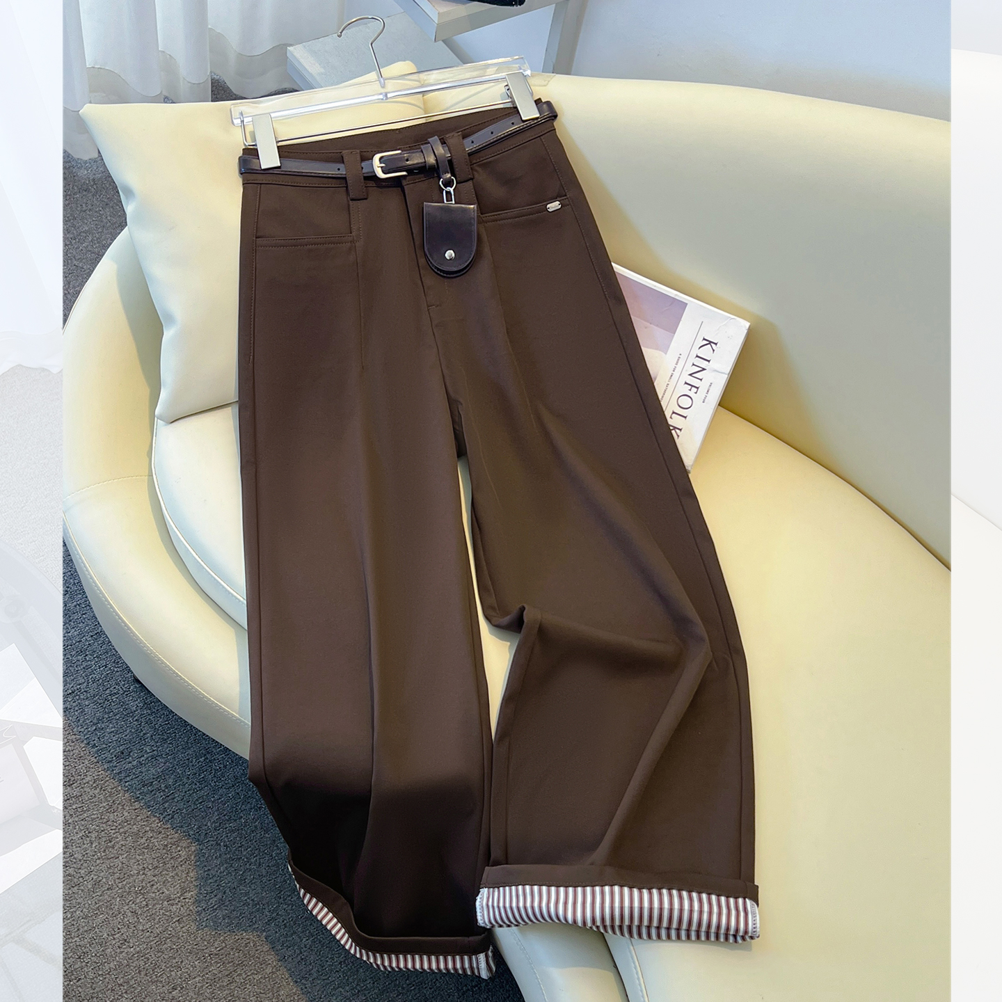 JONIbyBEB 秋冬版型ju好暗红反面皮绒腰带装饰脚口翻边阔腿牛仔裤