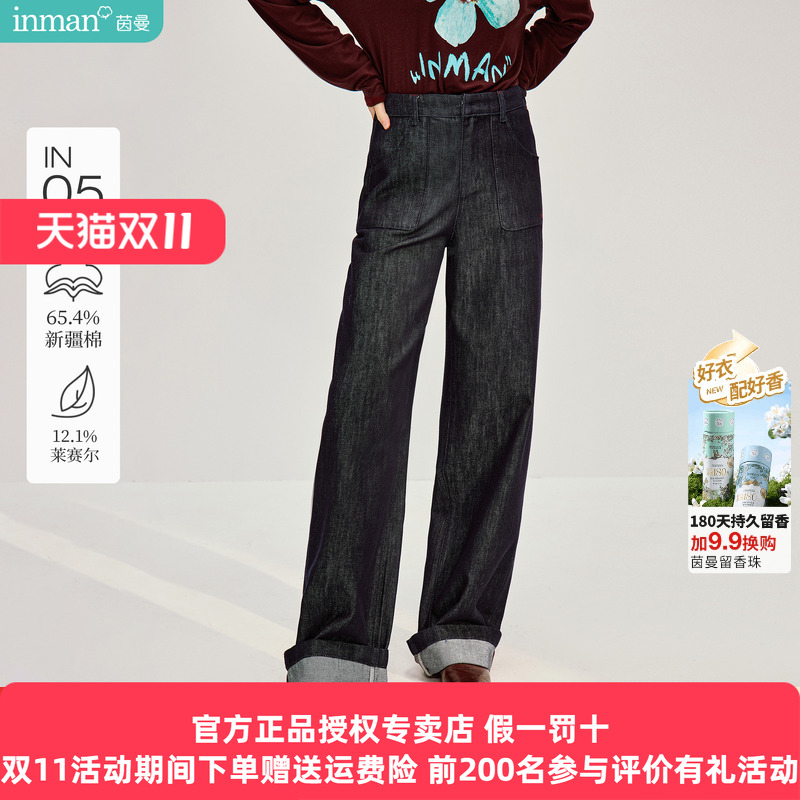 茵曼不易褪色高腰翻边阔腿牛仔裤2026春季女装新款复古宽松长裤