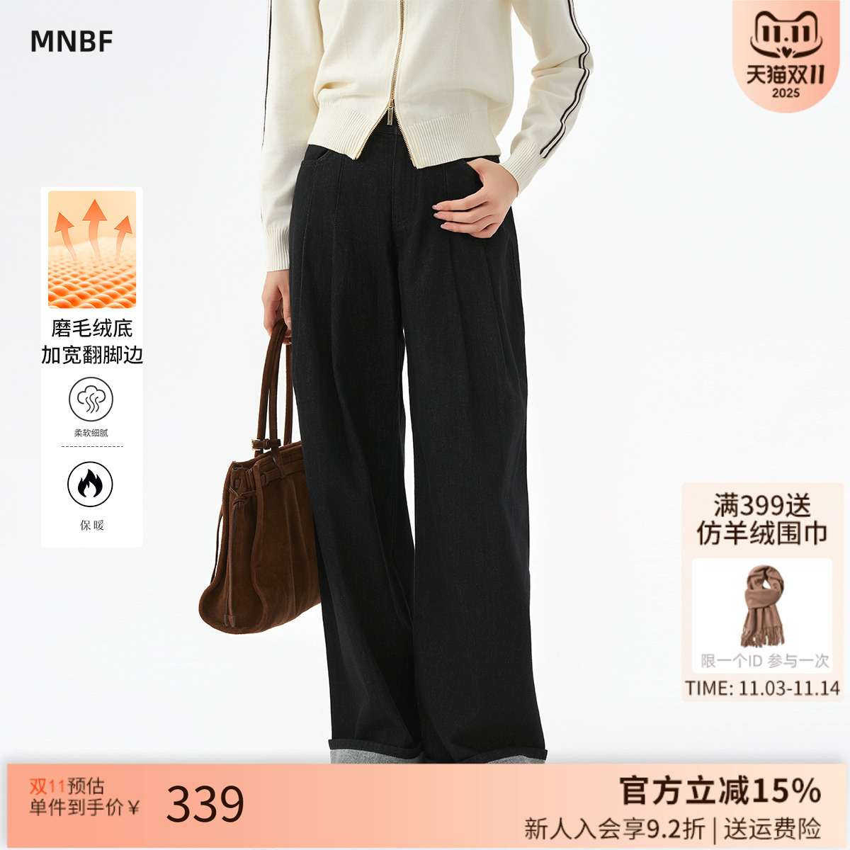 艾诺丝尚忆裤子2025秋季新品高腰翻边阔腿牛仔裤女显瘦324020