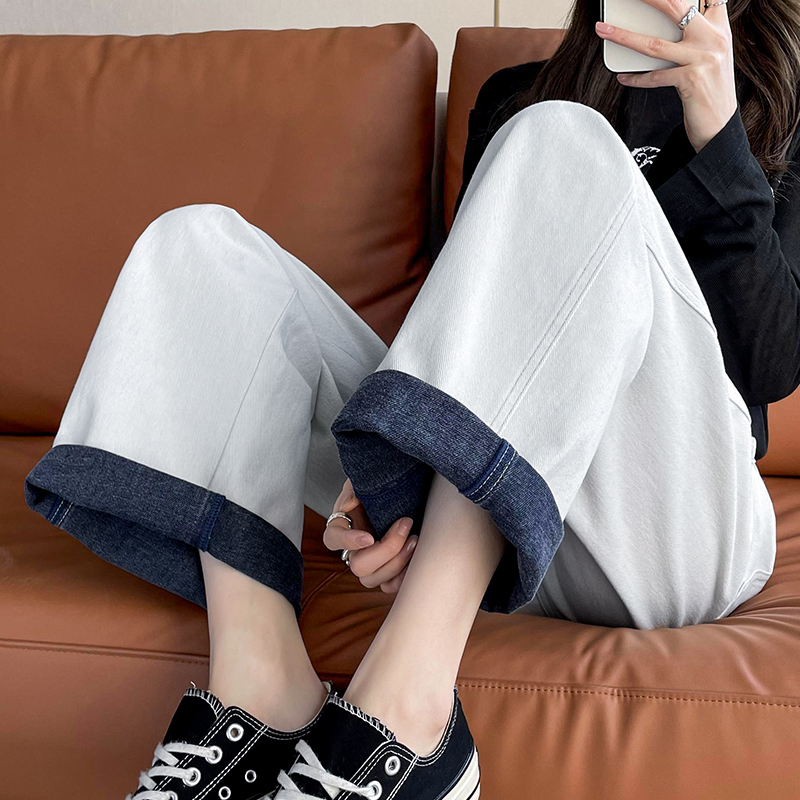 撞色翻边阔腿牛仔裤女春秋季2025新款裤子高腰垂感宽松显瘦直筒裤