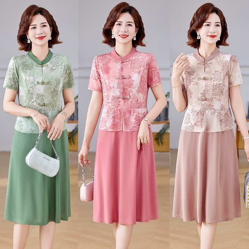 妈妈夏装连衣裙2024新款中老年女薄款洋气高贵假两件改良旗袍裙子