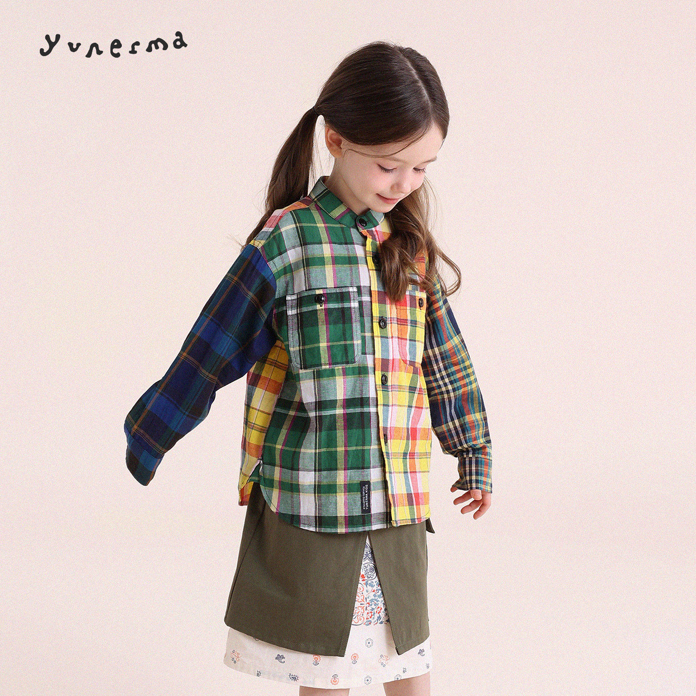 允儿妈女童日系亚麻混纺拼色格子衬衫宝宝春季时尚衬衣儿童上衣潮