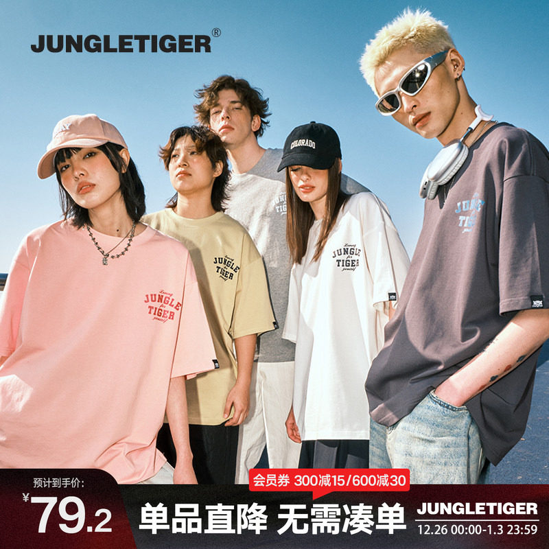 丛林老虎纯棉字母男生短袖潮牌夏日粉色T恤女重磅宽松情侣半袖夏