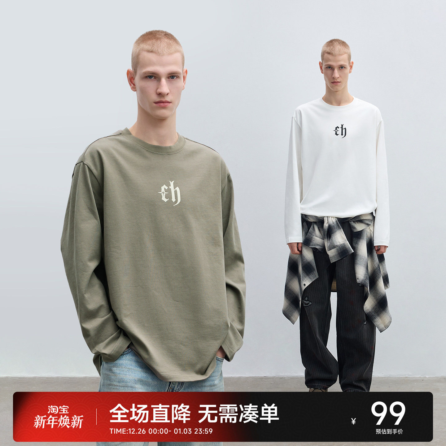 260G重磅长袖T恤男春秋宽松大码简约印花美式潮牌圆领打底衫男装