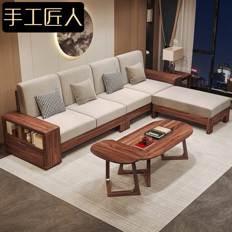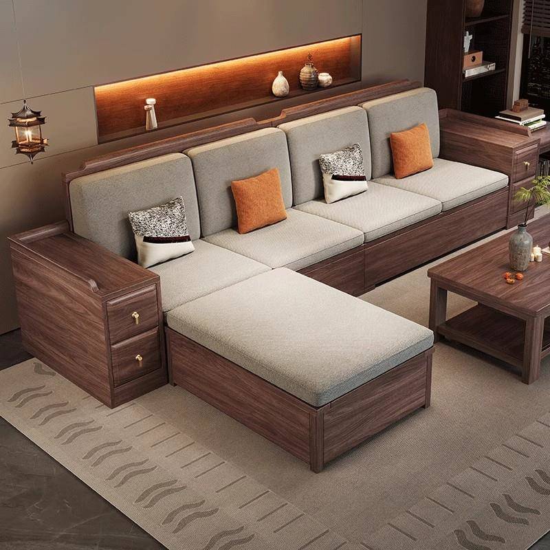 新中式黑胡桃实木沙发组合现代简约贵妃布艺储物大小户型客厅家具