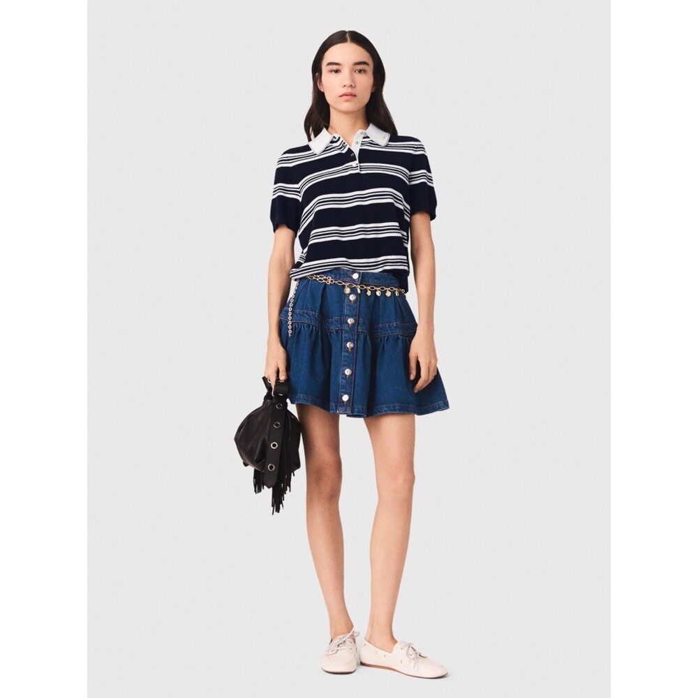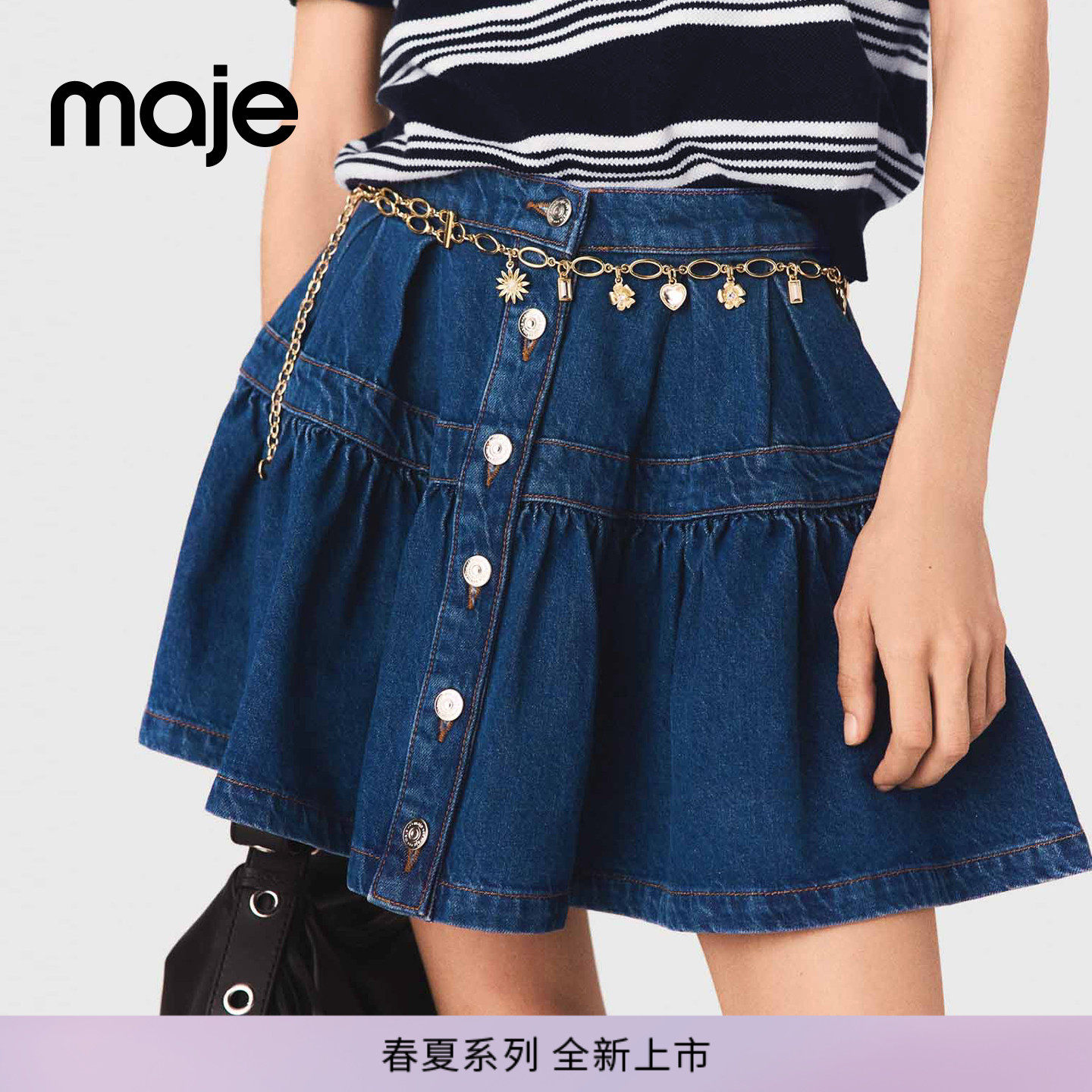 Maje2026春夏新款女装法式时尚蓝色单排扣褶皱短款高腰牛仔半身裙