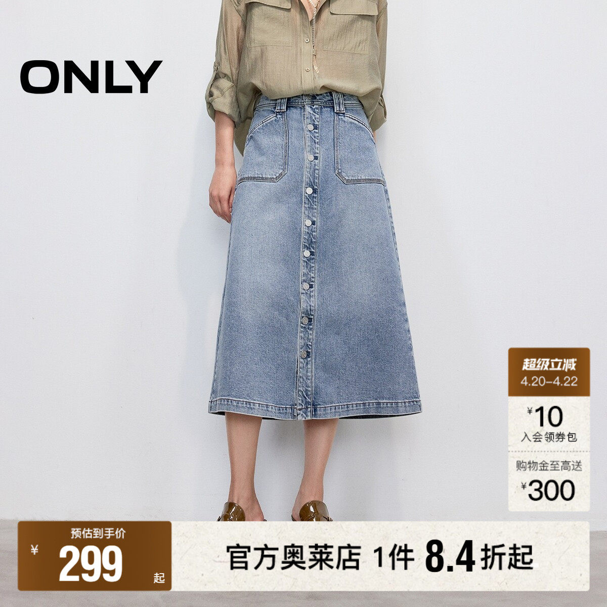 【ONLY奥莱】春夏设计感高腰磨白单排扣口袋牛仔中长裙半身裙女