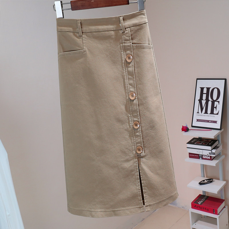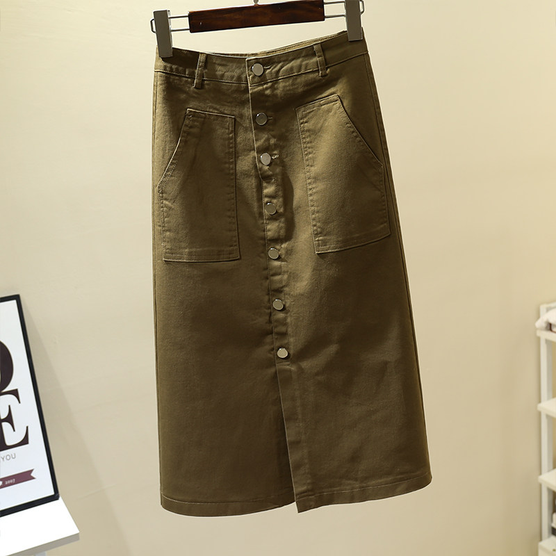 L407纯色排扣口袋显瘦A字裙春夏新款2023长裙百搭牛仔裙女半身裙