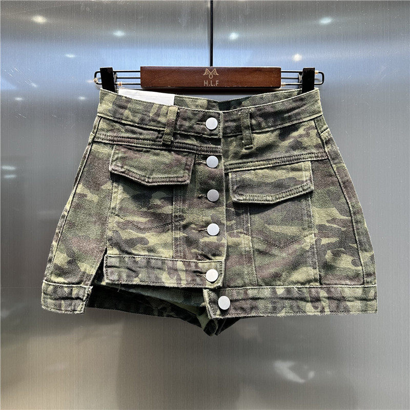 2026年春季新款美式工装单排扣迷彩不规则牛仔a字包臀显腿长短裙