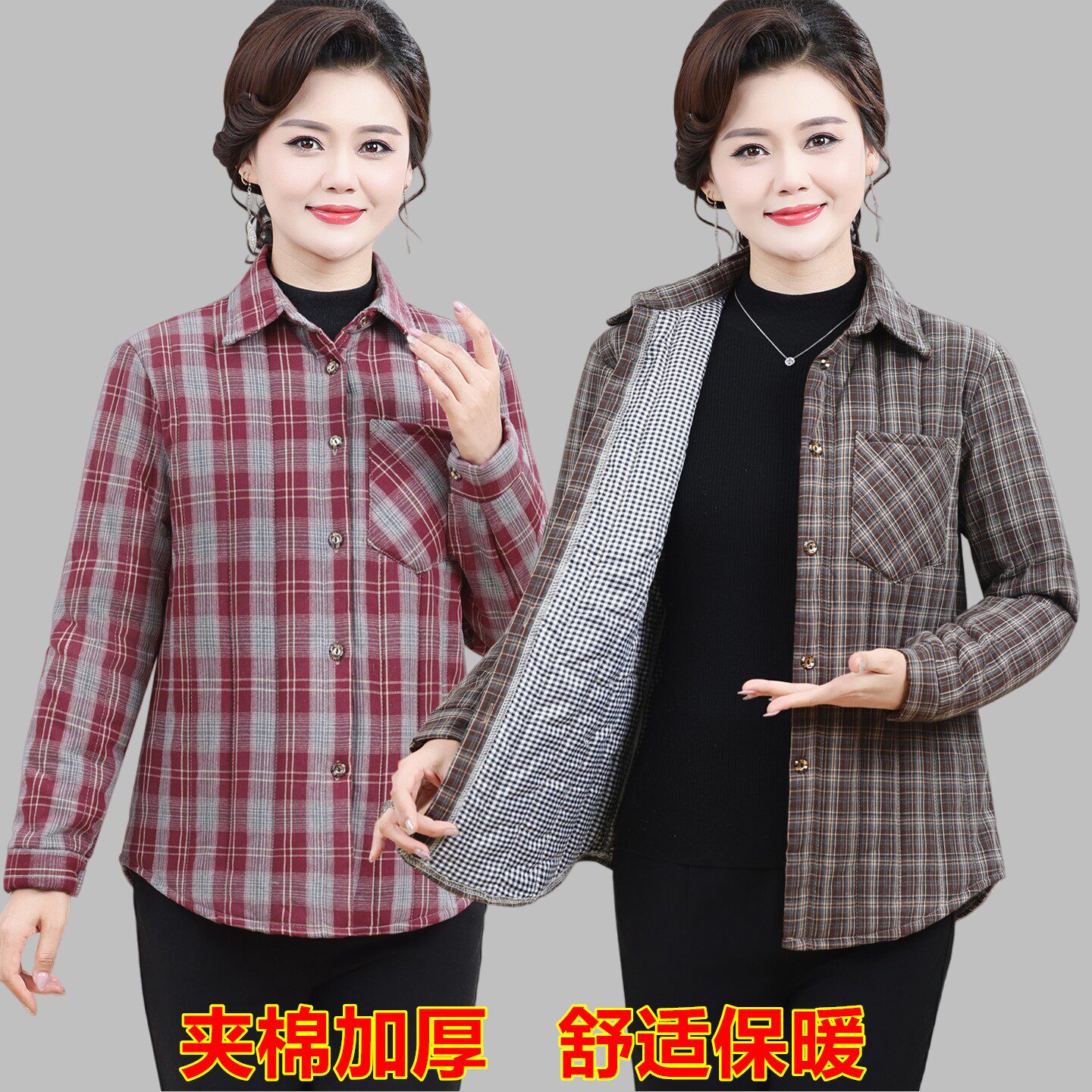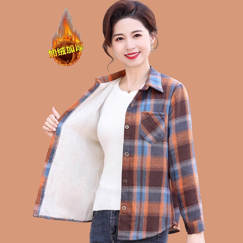 中老年妈妈装冬季加绒格子衬衫大码保暖休闲百搭长袖秋冬加厚外套