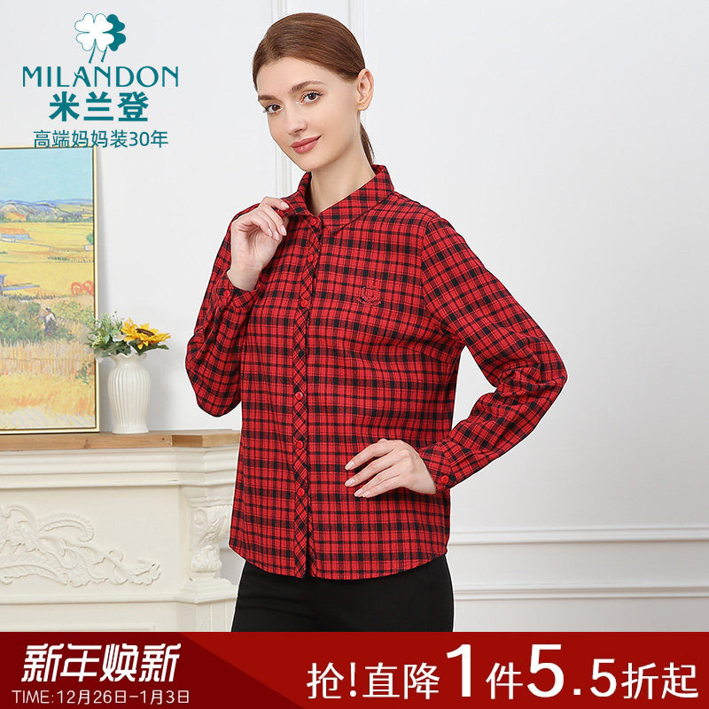 米兰登中老年妈妈装2025年秋季新款时尚翻领格子衬衫女长袖衬衣潮