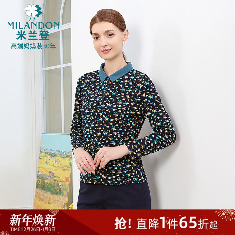 米兰登中老年妈妈女装2025年秋季新款时尚修身印花翻领长袖T恤衫