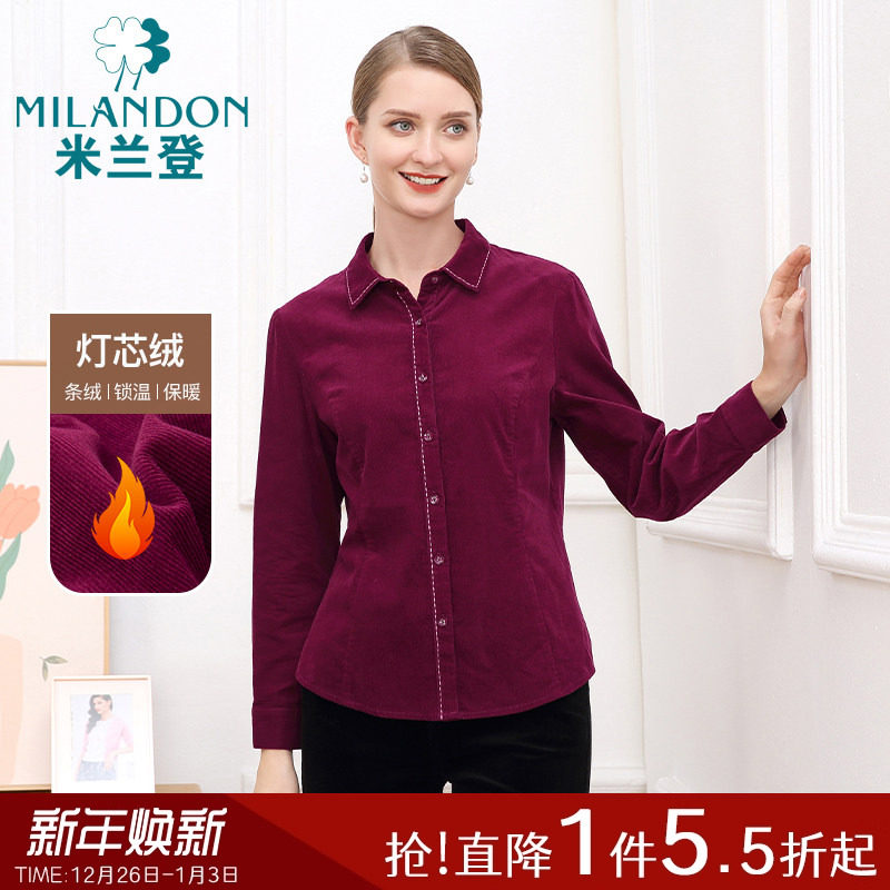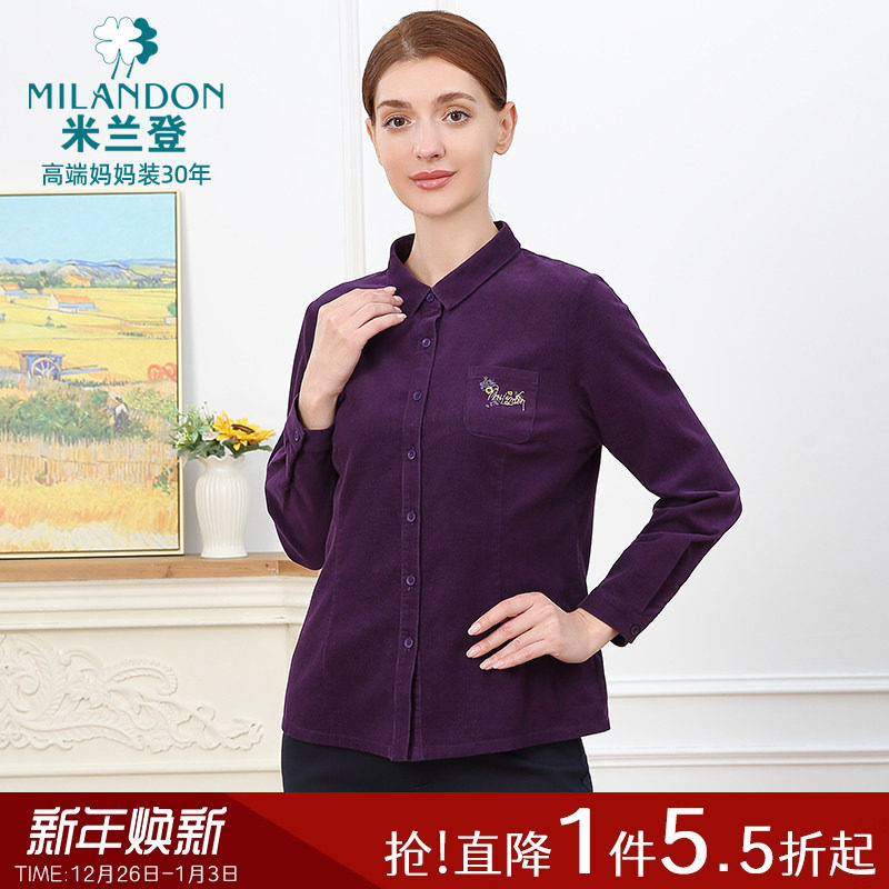 米兰登中老年妈妈装秋冬新款灯芯绒长袖衬衫纯棉保暖休闲条绒衬衣