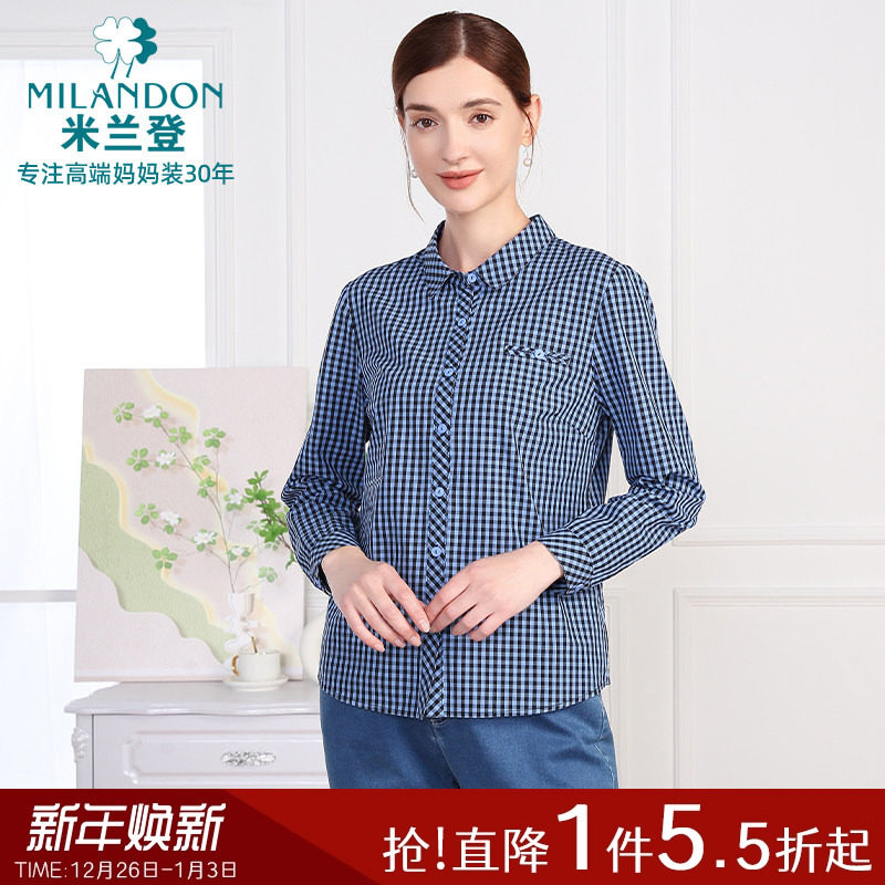 米兰登中老年妈妈装2025年秋季新款POLO领时尚格子衬衫女长袖衬衣