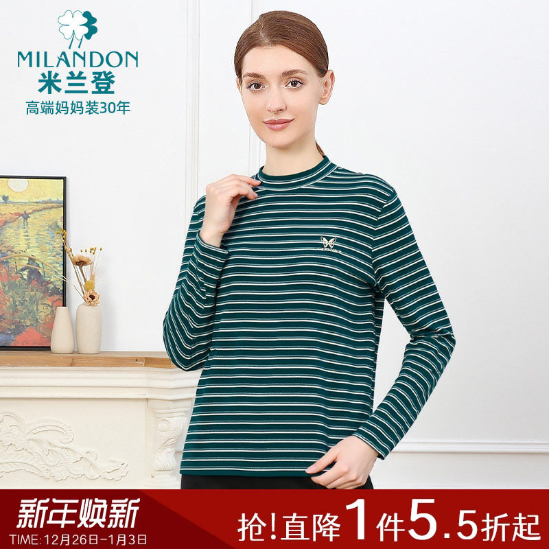 米兰登中老年妈妈装2025年秋冬季新款时尚条纹小衫女长袖T恤衫厚
