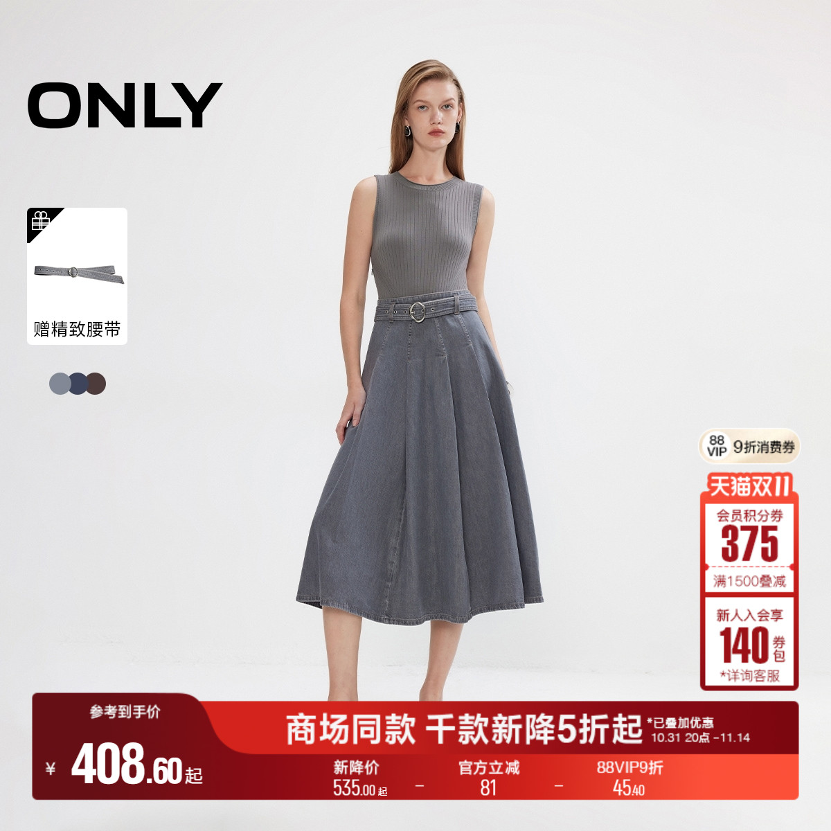 ONLY2025秋季新款收腰遮胯A字针织牛仔拼接无袖中长款连衣裙女