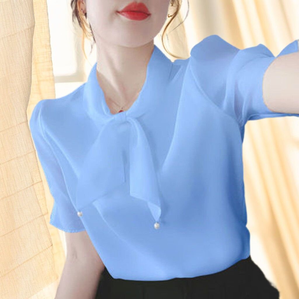 2026年新款女士蝴蝶结短袖上衣夏季大码百搭洋气小衫纯色雪纺衬衫