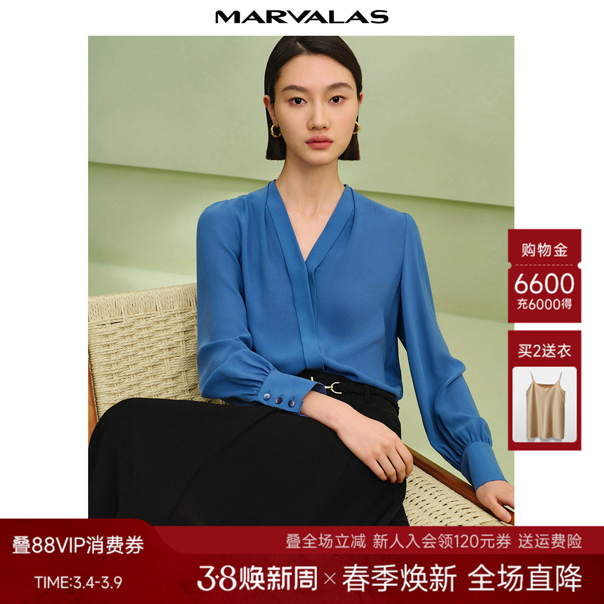 曼德诗醋酸雪纺衬衫2026夏季新款纯色克莱因蓝上衣设计感V领衬衣