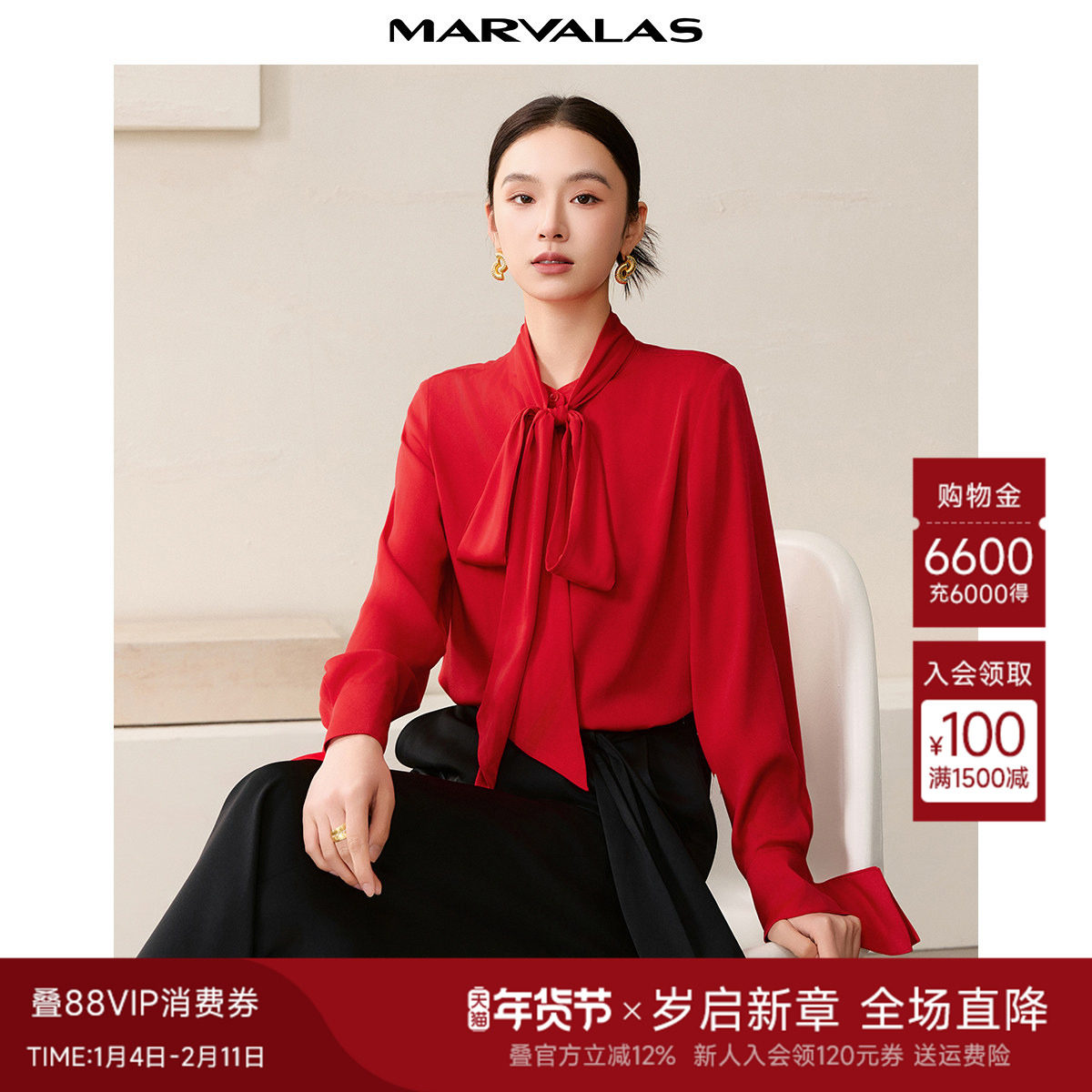 - 红色长袖雪纺衬衣女