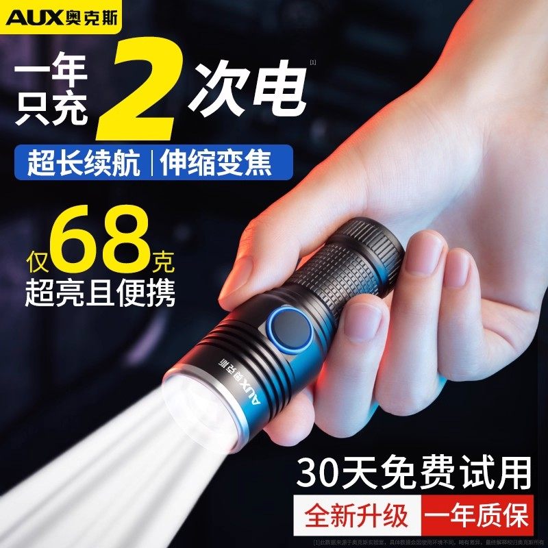 奥克斯强光手电筒迷你超亮户外可充电远射家用小型便携变焦应急灯