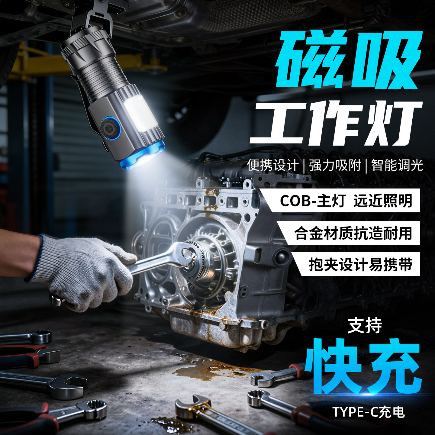 拉伸变焦USB强光手电筒迷你防水LED铝合金充电侧面COB磁铁工作灯