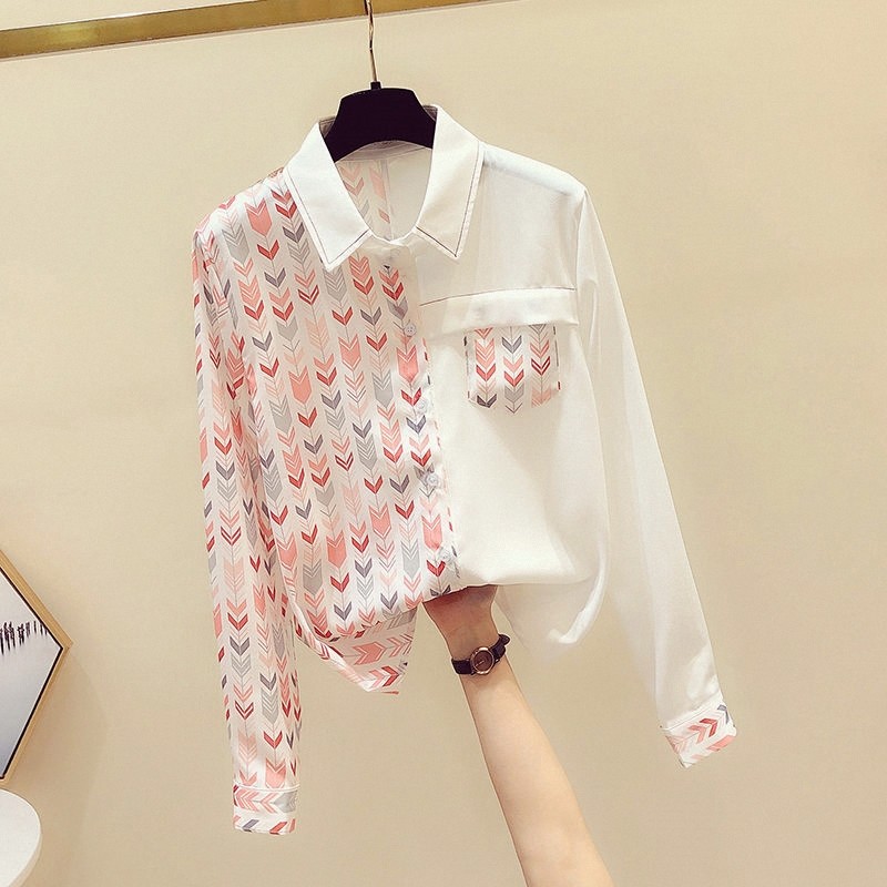 时尚V领碎花雪纺衬衫女宽松长袖粉色上衣洋气轻熟风花纱打底衫潮