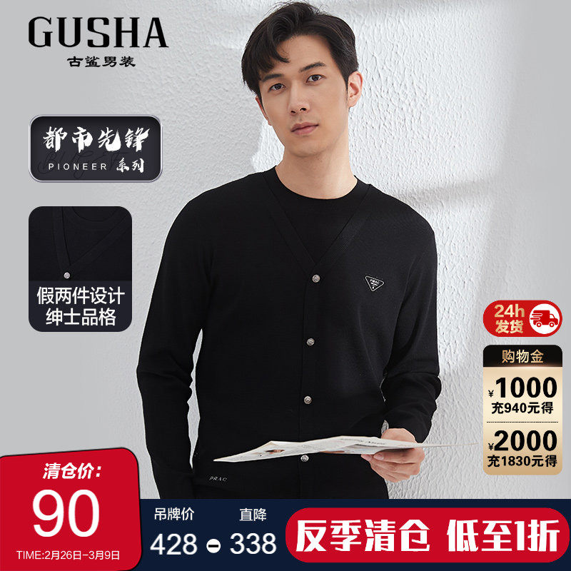 【清仓】古鲨黑色冰丝假两件文艺软毛衣男修身圆领针织衫2026春