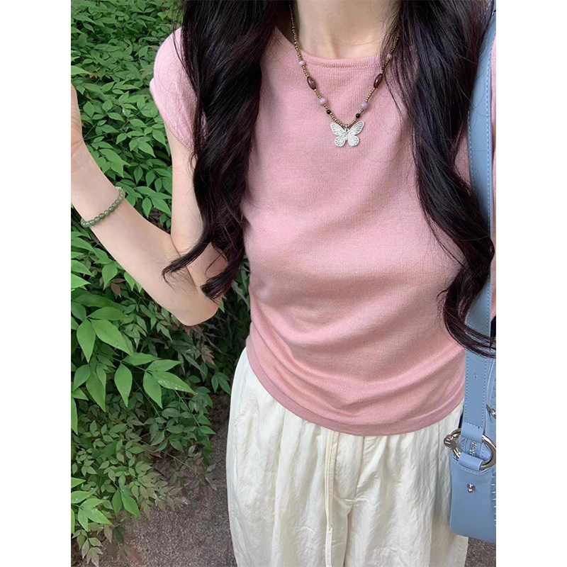 粉色圆领正肩短袖t恤女夏季薄款修身冰丝针织衫别致绝美短款上衣