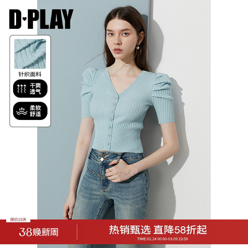 DPLAY年秋季新款蓝色上衣女法式独特修身冰丝针织衫短袖t恤